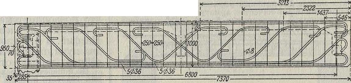 Плитное пролетное строение под железной дорогой, спроектированное Центральным отделом сооружений НКПС, изображено на фигуре 1 и 2. Отверстие моста 2,0 длина железобетонной плиты превосходит отверстие на 2-0,40 .м и составляет 2,80 .vt, ширина моста 4,0 м—меньше, чем нужно по габариту между перилами, так как последних не имеется. Балласт с боков плиты поддерживается стенками толщиной 0,20 м, возвышающимися над плитой на 0,35 метров Толщина пли ты в середине пролета—0,33 м, то есть около Ve пролета в свету, а по концам—0,29 м, так как плита имеет но верхней поверхности скаты с уклоном 4 %. Изоляция по скатам состоит из просмоленного джутового полотна с цементной смазкой толщиной 2,5 см, по проволочной сетке; у концов плиты щель между ней и устоем перекрыта под изоляцией железным листом. Продольные прутья арматуры диаметрами 14 и 24 миллиметров размещены на расстоянии 10 метров друг от друга; половина их имеет концы переведенными в верхний слой плиты, для принятия растягивающих напряжений, и сверх того для той же цели добавлено 15 прутьев диаметром 14 миллиметров, которые отогнуты в средней части плиты. В поперечном направлении поставлена распределительная арматура из стержней 0 10 миллиметров, через 20 сантиметров один от другого; подвески 0 6 миллиметров размещены через 15 см.
