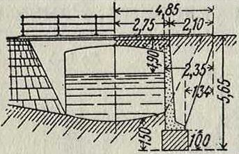 действием распора бокового свода, на соответствующей грани быков поставлено железо. Устои спроектированы своеобразно; насыпь спущена внутрь устоя естественным откосом, и земля не давит на переднюю стенку; для перекрытия же откоса применена железобетонная плита, поддержанная, кроме обратных стенок, еще двумя продольными. Бетона на мост пошло около 8 400 ма.