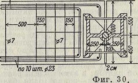 0,88 метров и в пятах 1,35 метров при постоянной ширине ребра 0,44 метров толщина плиты соответственно изменяется от 0,26 до 0,28 метров Продольные прутья как ребер свода, так и плиты его соединены поперечными связками из крученых прутьев диаметром 7 миллиметров (фигура 33), поставленных на расстоянии 25 сантиметров один от другого; эти связки держат продольные прутья на определенных взаимных расстояниях настолько прочно, что получается жесткая железная арка, к-рую можно было изготовить на рабочей площадке и целиком поставить на подмости. Проезжая часть моста поддерживается при помощи тонких (20 x20 ел) колонн, по 4 в каждом поперечном ряду, при расстоянии между рядами в замке_ 1,2×2,0 м, а в пятах 2,0x2,2 м; как видно, сечениеувеличивается к пятам не только по высоте, но и по ширине. Арки связаны распорками прямоугольного сечения, поставленными к замку ближе друг к другу, чем у пят. Колонны, стоящие на расстоянии 9,0 метров друг от друга (считая по горизонтали между осями), перекрыты сверху поперечной бй пролетом 6 м, на которую опираются пять продольных балок на расстоянии 1,50 м; между последними в свою очередь поставлены две дополнительные поперечные балочки. Продольные балки пролетом