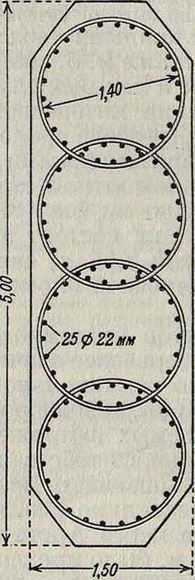между к-рыми идут три продольные балки, а между ними и затяжкой, для уменьшения длины контура (а следовательно и толщины) плиты, поставлена дополнительная поперечная балочка. Опорные части покоятся на небольших колоннах (устоях), соединенных между собой железобетонными распорками и диагоналями; основанием для устоев, в виду илистого грунта, залегающего на значительную глубину (12—20 At), служат железобетонные сваи восьмиугольного сечения 0 0,4 At и длиной 18 At.