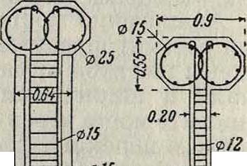 1,0 метров получились зазоры по 25 см, заделанные потом бетоном. Напряжения в бетонных шарнирах, исчисленные по формуле Герца, достигают 265 килограмм/см2.