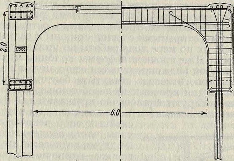поперечинами, толщиной в 10 см. Плита проезжей части имеет толщину 15 см. Высота пустого промежутка между сводом и плитой в замке—45 см. Таким образом, полная высота коробчатого свода в замке— 80 с.и, т. e. продета. Полотно выложено плитами, спрессованными из смеси асфальта с песком; толщина ездовой корки всего 5 см. На остальном протяжении пролета, где нет дополнительных продольных стенок, плита цроезжей части поддерживается поперечными балками, опирающимися на основные продольные ребра. В поперечных стенках оставлены отверстия для прохода. Основная арматура пролетного строения состоит из стержней, которые напоминают своей формой камышевый ствол, расколотый вдоль пополам; этот полукруглый профиль с перегородками на