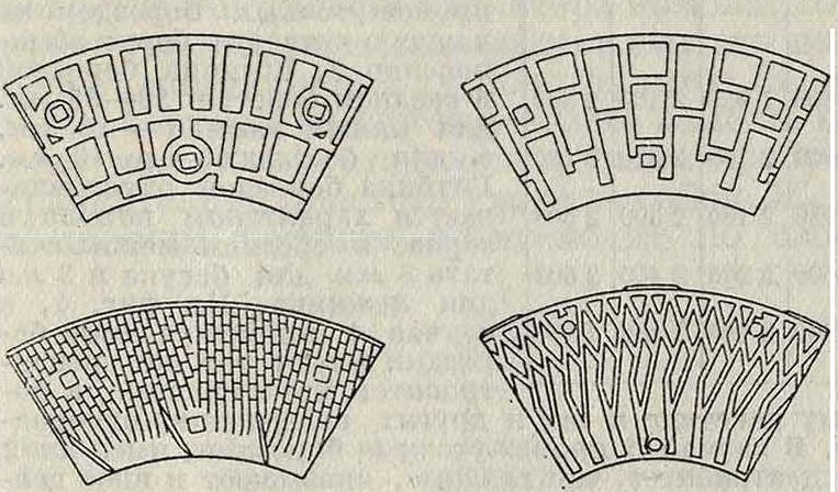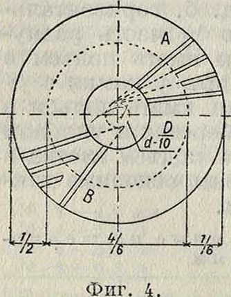 На фигуре 4 показано, как наносятся на камни прямолинейные бороздки; как по своей длине, так и по ширине бороздки неодинаковы. Бороздки, идущие от самого глаза и делящие всю поверхность камня на т. н. четверки, носят название в зависимости главных бороздок. Короткие бороздки называются промежуточными. Число главных бороздок для камня 0 I 000 миллиметров в среднем, можно брать 12, для камня 0 1 200 .иле—14 и для камня 0 1 400 миллиметров—16, промежуточных бороздок на каждую четверку берут обыкновенно 2. Ширина бороздок в среднем берется 30—35 миллиметров, для малых камней — 25 миллиметров, а для больших — до 40 миллиметров. Глубина бороздок обусловливается характером помола и зерна; в среднем можно считать 5 миллиметров для бегуна и 3 миллиметров для лежняка. На фигуре 4, в случае А промежуточные бороздки имеют тот же эксцентриситет, что и главные, а потому действие и тех и других совершенно однородно. В случае В промежуточные бороздки, имея иной эксцентриситет, чем главные, оказывают и иное действие на продукт. В случае В угол наклонения у всех бороздок каждой четверки разный, а именно: у главных он меньше, что хорошо для разрывания и разрезания, а у промежуточных он больше, что способствует выталкиванию продукта. Вследствие отмеченных достоинств, бороздки типа В очепь распространены в практике. Следует упомянуть о т. н. новых круговых бороздках, расположение которых см. на фигуре 5. На промежутках между главными и промежуточными бороздками на мелющем поясе параллельно главным насекают мелкие бороздки, называемые штрихами или нитками. Число таких бороздочек берется от 15 до 25, глубина—от 0,5 до 1 миллиметров.