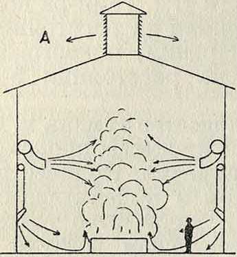 Задача, предъявляемая вентиляции, может формулироваться трояко: 1) полное обесту-манивание помещения и создание в нем нормальной влажности; 2) уничтожение тумана, но с сохранением повышенной влажности около источников парообразования; 3) уничтожение тумана в низкней рабочей зоне с повышенной влажностью в ней. Первая задача разрешима только применением закрытой вентиляции; вторая разрешается общей вентиляцией с удалением воздуха из верхней зоны и притоками, направленными частью с нормальной темп-рой в нижнюю зону, частью же с темп-рой возможно более высокой (60—100°) в среднюю зону (фигура 1, А); третья задача разрешается созданием вытяжек из верхней зоны и притоков воздуха нормальной ί° в нижшою зону (фигура 1, В). Радикальное разрешение задачи дается только первым способом. При правильном проектировании этот способ является, кроме того, и наиболее рентабельным.