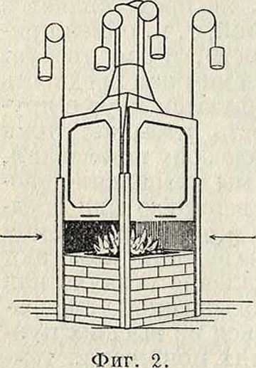 Медно- и цинколитейные. Процессы крайне вредные (литейная лихорадка). Общая вентиляция не позволяет рассчитывать на полное удаление вредности. Применение зонтов над тиглями и формами дает удовлетворительные результаты. Зонты над формами очень затрудняют производство, почему их и следует делать подвижными, вращающимися и тому подобное. Продуманное размещение пунктов отливки значительно облегчает задачу (фигура 4).