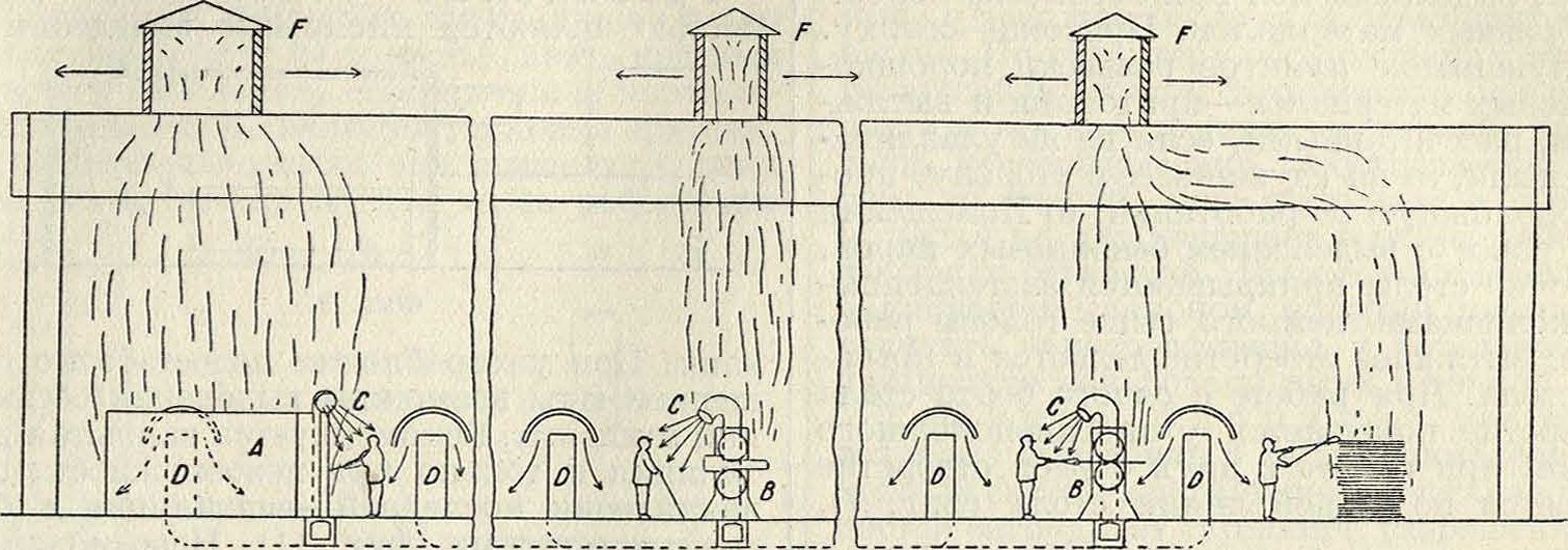 На фигуре 5 изображены план и разрез вентиляции прокатного цеха: А—печь, В—прокатные станы, С— души около станов и печи, D—притоки общей вентиляции, F—вытяжки. зона получает высокую ί° благодаря лучеиспусканию из печных отверстий. Вытяжные” отверстия необходимо устраивать из-под перекрытия; притоки—в нижнюю или среднюю зону. Над пунктами пребывания людей следует устраивать воздушные души. В зимнее время вполне возможна циркуляция воздуха или раздробленный приток в верхнюю зону (фигура 6). Воздушные души иногда