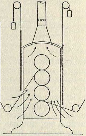 щее время барабаны редко остаются незакрытыми. Отсос воздуха из-под закрытий происходит через щели для входа и выхода материи (фиг, 22). Кроме того, необходимо давать засосы в те же закрытия или независимо от них. Горячие барабаны, создавая под закрытиями горячий и влажный воздух, являются мощным источником тепла, могущего быть использованным для вентиляционных целей путем тепло-уловителей. Последние дают подогретого воздуха больше, чем требуется для нужд отделения, почему он может быть применен и для других отделений фабрики. Сообразно с наличием тепловыделений притоки даются в нижнюю или среднюю зону, з) Печатные отделения. Вредности: анилиновые пары и высокая темп-ра. Вентиляцию этих отделений полезно связывать с вентиляцией сушильного отделения, почти всегда располагаемого под ними. Воздух верхней зоны печатного отделения удаляется в сушила. Приток в печатные отделения направляется в виде душей над рабочими пунктами, и) Сушильные отделения. Вредности: пары анилина, влажность и-высокая темп-ра. Задачей вентиляции является, во-первых, локализование тепловыделения в рабочей части отделенияпутемнетепло-проводных переборок и, во-вторых, создание в рабочем пространстве повышенного давления, а в сушилах пониженного, для того чтобы вредности не могли вырваться через щели для входа и выхода материи. Так как все же некоторое количество паров анилина и некоторое количество тепла выносится из сушильной камеры самою тканью, то необходимы, прежде всего, предупредительные меры: последний оборот ткани, идущий к выходу из сушила, проветривается встречным током воздуха в узком канале, отгороженном от пространства сушила. Само рабочее пространство получает вытяжку из верхней зоны и приток в среднюю зону ИЛИ Душ. А. Н. и Н. А. Селиверстовы.