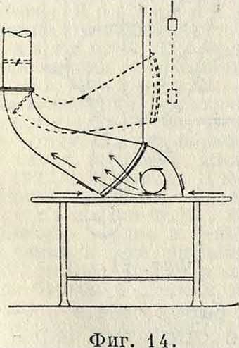 Деревообделочные. Вредностью является лишь пыль, выделяющаяся, однако, в громадном количестве. Единственное сред ство борьбы с нею—это применение закрытой системы (фигура 14 и 15). Однако, не все деревообделочные станки допускают закрытие. В таких случаях полезно устраивать путем перегородок кабинки, осаждающие пыль и локализующие ее от остального помещения. По характеру обслуживания станков пылеулавливающим устройством они разделяются на две группы: в первой группе пыль непосредственно захватывается отсосом; во второй—она поступает в сборник и, падая на дно, вступает в район действия засосных отверстий. Вытяжная система заканчивается циклоном, который полезно устраивать непосредственно у котельной для автоматической подачи пыли в топки.