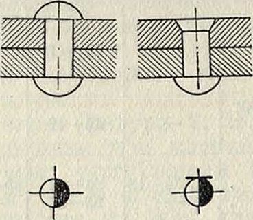 (фигура 2, А); для соединений, от которых требуется лишь прочность (металлич. конструкции, мосты), достаточна головка меньших размеров (фигура 2, Б). В СССР оба типа объединены в один (ОСТ 301), размеры которого даны на фшг. 2, А. 2) П о т а и н а я—обладает меньшей прочностью по сравнению с остальными формами и применяется лишь там, где выступание головки совершенно недопустимо (фигура 2, В). 3) Полу потайная (фигура 2, Г) применяется часто в тех случаях, когда выступающие головки мешают или необходимо достижение особой плотности заклепочн. соединения (нефтеналивные суда, цистерны для нефти и ее погонов). 4) Кони ч е с к а я—наиболее легкая для образования вручную, без помощи обжимки (фигура 2, Д), применяется поэтому в неудобных для работы местах в качестве замыкающей головки.