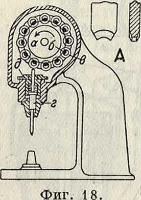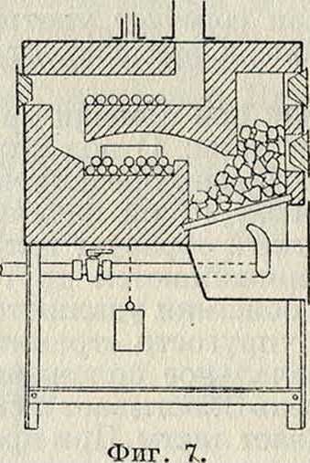 Клепка и клепочные машины. Постановка 3. на место совершается ручным или машинным способом и в обоих случаях может быть горячей или холодной. Первой операцией при горячей клепке является нагрев заклепки. Обыкновенно для этой цели применяют обычные переносные горны, снабженные вентилятором, приводимым в движение или рабочим или воздушным инжектором, работающим сжатым воздухом. Несмотря на большое распространение этих печей, им присущи значительные недостатки, из которых главные: высокий расход топлива (100—200 килограмм и более угля на 100 килограмм нагреваемых 3.), легкая возможность перегрева или неравномерного нагрева 3. (5—10% сожженных 3.), образование большого количества окалины и вредное влияние заключающейся в топливе серы на механнч. качества металла 3. Часть этих недостатков отсутствует в пламенной печи, изображенной на фигуре 7; так как 3. не соприкасаются непосредственно с углем,