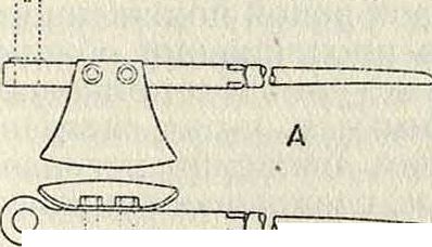 При ручной клепке звено состоит из 5—6 рабочих: старшего, 2—3 бойцов, рабочего, держащего подбойку, и мальчика у горна. Порядок работы таков: нагретая добела 3. подается к месту клепки, причем сначала, для освобождения от окалины, ей ударяют о край горна и взмахивают в воздухе; затем она вводится в отверстие, и под нее подводят подбойку (фигура 9а) или особый поддерживающийдом-крат (фигура 96); после этого старший молотком указывает