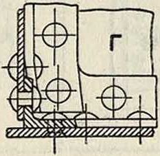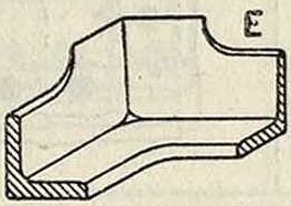 рядным швом внахлестку, листы днищ соединяют тем же способом или при помощи простых накладок. Соединение днища со стенками делается почти исключительно при помощи кольца или рамы из углового железа. Типичные примеры для круг- лых резервуаров даны на фигуре 24, А, Б, для прямоугольных—на фигура 24, В, Г и Д. Соединение вертикальных углов в прямоугольных резервуарах делаются с. загибом стенки (фигура 24, В) или при помощи особого уголка (фигура 24, Г и Д). Последний способ придает известную жесткость соединению, нотребует изготовления сложных откованных частей в тройном стыке у дна (фигура 24, Е и уЕ). л. павлушнов.