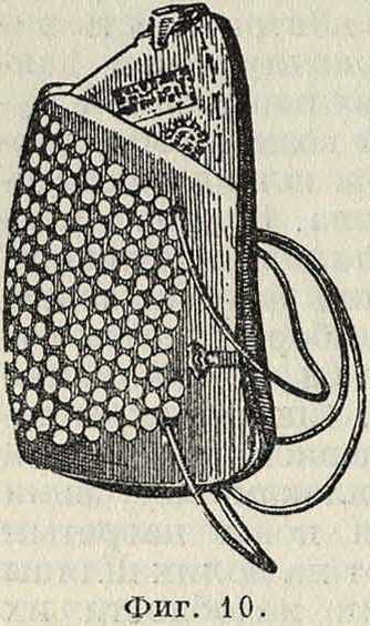 возможность раздражения десен трением загубника), или я-te посредством полумасок (защита рта и носа) и масок (защита всего лица и глаз). Маски и полумаски должны плотно прилегать, не давить на кожу, не раздражать ее, иметь возможно меньшее «вредное пространство» (накопление выдыхаемой углекислоты), быть из легкого, несгораемого и не портящегося от производственных вредностей материала; фильтры должны легко сменяться и очищаться. Существуют следующие типы пылевых респираторов. а) Респираторы без клапанов. Сплошная фильтрующая поверхность имеет вид повязки, которая закрывает рот и нос, или натянута на каркасную полумаску, или же укрепляется между двумя ажурными слоями металлической полумаски (фигура 10).