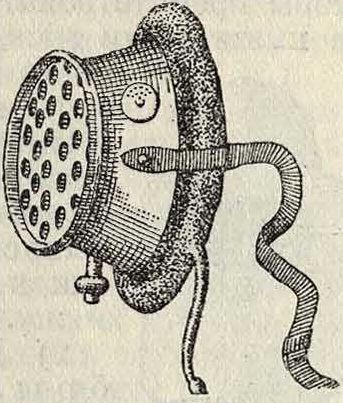 Такие респираторы дают относительно небольшое сопротивление, но имеют тот недостаток, что часть испорченного выдыхаемого воздуха задерживается между маской и лицом. Если фильтр занимает только часть поверхности респиратора, то недостаток этот усиливается и сопротивление больше, б) Респираторы с металлическ. разборным фильтром (в СССР—типа, предложенного доктором Маршак, Институт охраны труда). Пыль проходит извилисто через ряд пластинок, снабжен-ных различно расположенными отверстиями. Эти респираторы обладают небольшим сопротивлением (27а миллиметров), но пропускают довольно много пыли (до 15 %), почему они и рекомендуются лишь для неядовитых и неедких видов тяжелой пыли (фигура 11).