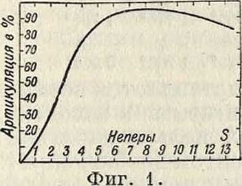 На фигуре 1. представлено изменение коэффициента артикуляции (отношение количества принятых слогов к числу переданных) в зависимости от силы звука. На оси абсцисс отложена в неперах чувствительность S=1п~, где P—эффективная ам-