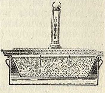 Влажность 3. (содержание в нем воды) имеет большое значение при его хранении; во влажном 3. развиваются биологич. процессы, вызывающие распад органич. вещества с выделением С02 и воды. Влажное 3. легко поражается плесневыми грибками. Повышенная влажность препятствует правильной оценке, наир., абсолютного веса и натуры 3. Определение влажности 3. производится или весовым методом или путем отгонки воды из 3. (метод Гофмана). При весовом методе определяются потери веса при высушивании небольшой навески 3. (ок. 6 г). Высушивание производится или до постоянного веса, в обычном сушильном шкафу при 105°, или в особом аппарате Тринклера. В первом случае 3. сушится до постоянного веса, сначала в неразмолотом, а затем в размолотом состоянии. Вся операция занимает до 20 час. времени, т. к. испарение влаги происходит крайне медленно. Аипарат Тринклера отличается от обычного сушильного шкафа тем, что в нем нагретый воздух циркулирует и т. о. ускоряет испарение воды. Сушка 3. в нем продолжается 40 мин. при 130°. Последнее время стали пользоваться аппаратом Форне, в к-ром сушка производится при 160°. Определение производится очень быстро, но менее точно. Метод Гофмана (фигура 3) заключается в помещении измельченной навески 3. в резервуар с маслом а, ί° которого доводится до 180°, и в отгонке воды вместе с ом или с о-скипидарной смесыо (жидкостями, не смешивающимися с водой). Количество отогнанной воды узнается но шкале, нанесенной на трубке Ь, куда после охлаждения в холодильнике с стекает вода. Срок определения 15-Р20 мин. У нас аппарат Гофмана применяется обычно в видоизменении Головченко. Броун-Дювалем построен аппарат (фигура 4), основанный на методе Гофмана, позволяющий делать сразу по нескольку определений и упрощающий некоторые детали операции.