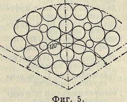 траверсы τ и тх укреплены на станине машины. Через них проходят две трубки о и о, на которых надеты диски а яр. Диск а неподвижен, а диск р вращается на трубке о, получая движение от главного вала машины; на диск р надевается катушка, или бобина, s с пряжей. На диске а имеется стойка с на которой укреплен ролик b с бумажной лентой. На том же диске имеется стойка d; к ней укреплен зажим к, в котог ром укреплен формирующий бумагу калибр т. Устройство этого калибра таково, что он свертывает бумагу трубкой,охватывая ей медную жилу. В сечении получается примерно треугольник, к-рый показан на фигуре 34, где а—медная жила и б—бумажная изоляция. Над трубками о и о имеется тяговая шайба, получающая движение от главного вала //f~ машины. Строятся такие машины А1 на 6—10 концов в одной станине.