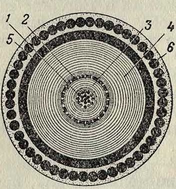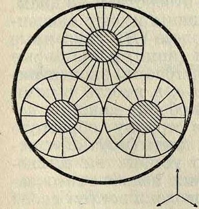 Здесь Бг—барабан с голой жилой, з, з!—зубчатки, Б— ролики с бумажной изолировочной лентой, Т — тяговая шайба, Бп—приемный барабан, шк— шкив, получающий движение или от отдельного мотора или от трансмиссии, к — коренной вал, с—стойки для дисков, и о, Οι — патрубки. Действие машины следующее. Голая жила, получая поступательное движение от тяговой шайбы (сама тяговая шайба получает движение от коренного вала, на фигуре не показанного), движется по направлению, указанному стрелками; три стойки с укреплены неподвижно на плите р; на каждой стойке укреплено по 4 ролика Б с бумагой; плита р связана в одно целое с зубчаткой з и вращается вокруг своей геометрич. оси о, ох; т. о., стойки с с роликами Б также вращаются вокруг оси о, о, или, иначе говоря, вокруг поступающей жилы; бумага сматывается с роликов и изолирует жилу столькими слоями, сколько поставлено роликов. Изолированная жила идет в сушильный аппарат и после сушки на свинцовый пресс для опрессовки свинцовой оболочкой. Иногда такие К. по требованию заказчика пропитываются изолирующими составами. Пропитка делается для того, чтобы предохранить жилу К. от влаги, если, наир., свинцовая оболочка имеет где-либо дефект. Если бронированный К. предназначается для прокладки в земле, то он бронируется круглыми или сегментными проволоками.