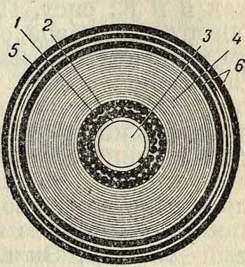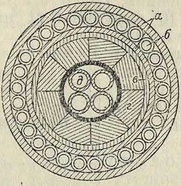 диам. которой берется от 0,3 до 0,5 миллиметров. Делается это для увеличения самоиндукции К. Обработанная т. о. жила изолируется или бумажной или гуттаперчевой изоляцией; если изоляция бумажная, то К. спрессовывается свинцовой оболочкой. Обвивка жилы железной лентой производится на машинах, аналогичных машинам, изображенным на фигуре 47, с той разницей, что конструкция их тяжелее и на место катушек с пряжей ставят катушки с железной проволокой.