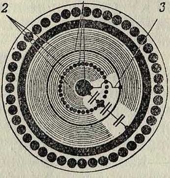 Пары жил с роликов проходят через желобчатые распределители к геометрической оси колец. Здесь при вращении кольца все пары скручиваются в К. Сквозь полую ось w идет одна или несколько пар, которые служат сердечни-
