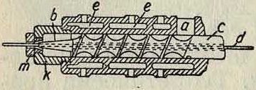 Другой барабан с изолированной жилой помещается на стойку Ь, где он может свободно вращаться на оси. Жила с этого барабана протягивается через трубку е. Далее жила направляется по одной из дуг с с к правому полому шипу и выходит через него к крутильной головке п. Жила с барабана, висящего на оси d, направляется через правый шип тоже к головке η. Т. к. головка вращается, а жилы имеют поступательное движение благодаря тяговой шайбе, то они скручиваются с известным шагом в пару. Шаг скрутки можно менять посредством скорости хода тяговой шайбы Т. По выходе из крутильной головки п скрученная пара проходит розетку к, и пары скрепляются ниткой. Движение машина получает через шкив у, крутильная головка получает вращение от валика г. Такие машины фирмы Hasse и Со. (Германия) при барабанах 250 миллиметров в диам. и 120 миллиметров ширины за 8 ч. производят ок. 20 000 метров.