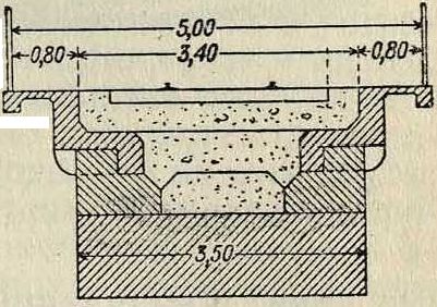 На фигуре 5—7 представлен мост des Amidonniers в Тулузе, законченный постройкой в 1910 году. Мост имеет 5 пролетов, от 38,5 до 46,0 м, со сводами, очерченными по эллипсу, при подъеме от 1 : 4,17 до 1 : 4,08; над быками для увеличения отверстия моста в высокую воду и для красоты сделаны просветы, перекрытые сводиками с пролетами в 10,1 и 11,6 метров Основания быков заложены в несжимаемом водонепроницаемом туфе, местами прикрытом наносами, с помощью перемычек, которые устроены затопляемыми высокими водами Гаронны. Полотно моста, шириной 22 м, поддерживается двумя сводами по 3,25 метров с просветом между ними в 10,0 метров Толщина сводов в замке—1,26, 1,21 и 1,18 м, в пятах—2,59, 2,52 и 2,42 метров Соответственно двум полосам свода быки состоят из двух совершенно отдельных частей; туф в промежутке между ними прикрыт ростверком из каменной кладки с защитными поперечными стенками. Для поддержания полотна моста поставлены поперечные железобетонные балки (в виде безраскосных ферм) через каждые 3 м; балки опираются на своды по их продольной оси и имеют, т. о., пролет в 13,15 метров Тротуары расположены на· свесах длиной 4,72 м; свесы усилены на сжатие спиральной арматурой. На плите толщиной 12 см, покрытой несколькими слоями смолы, положен слой бетона в 5 см, слой смазки в 1 сантиметров и деревянная мостовая. По сравнению с мостом со сплошными сводами на всю ширину моста этот мост дешевле на 30%.