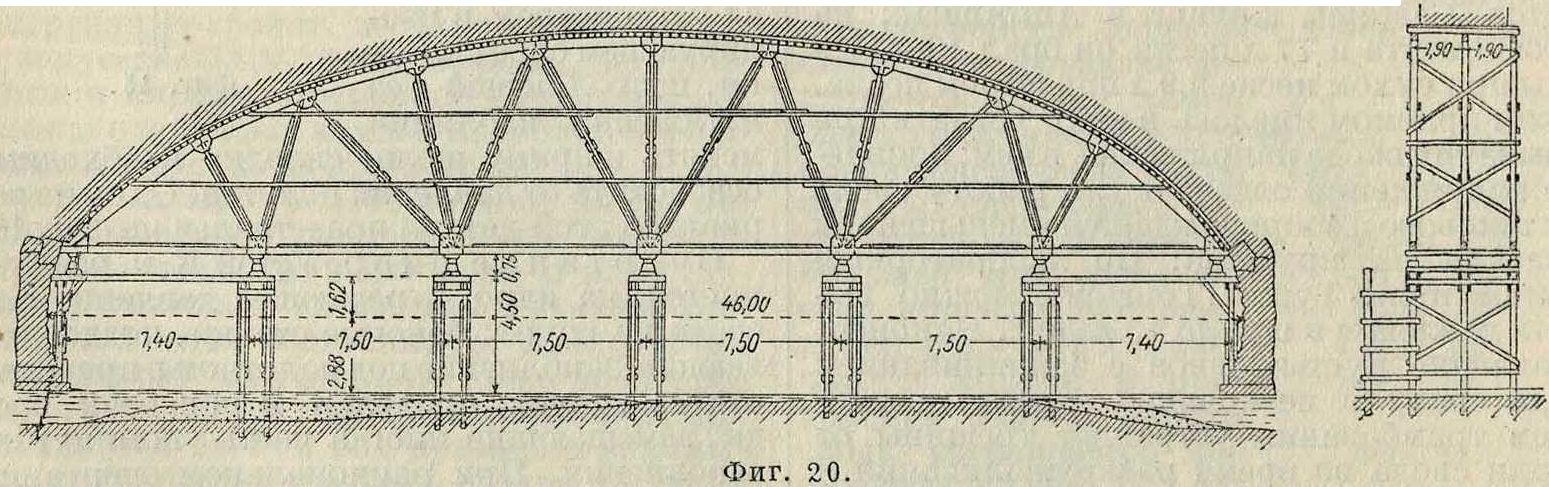 жесткости, кружала утверждают на деревянной башне, поддерживающей середину кружал в пролете. При постройке длинных многопролетных или очень широких мостов деревянные кружала заменяются иногда железными, к-рые, кроме выгодности многократного применения, имеют еще преимущество большей жесткости. Главный недостаток их — большая чувствительность к колебаниям ί°. Железные кружала применяются также в случае малой строительной высоты или необходимости оставления во время производства работ значительного судоходного пролета.