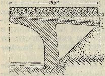 В массивных устоях с излишним количеством кладки, являющимся мертвым грузом и увеличивающим давление на основание опор, необходимо прибегать к уменьшению кладки путем устройства продольных или поперечных проемов, перекрытых сводами.При средней высоте насыпи, примерно до 10 ж, с успехом применяется продольный свод для перекрытия пространства между передней стенкой устоя и обратными, что дает возможность освободить от давления засыпки переднюю стенку и почти уравновесить давление земли на обратные стенки (фигура 16 и 17). Для уменьшения распора полезно продольному сводику давать возможно больший подъем или заменить его железобетоннойплитой.Ус-тройство поперечных проемов лучше согласуется с наличием распора со стороны пролета (фигура 18); во избежание прохода вод одного пролета временной нагрузкой равнодействующая давлений на швы и на подошву фундамента не должна выходить из средней трети. В исключительных случаях допускается выход кривой давления из средней трети, причем растягивающие напряжения в кладке не должны превышать 2 килограмма/см2.