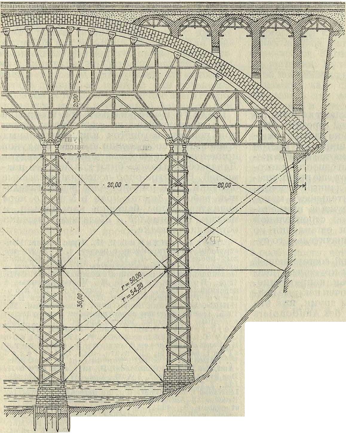 Одним из серьезнейших вопросов, возникающих при постройке К. м., является вопрос о кружалах, в связи с их деформацией при кладке свода; за деформацией кружал неизбежно должен следовать и незамкнутый еще свод, который представляет собою, однако, при употреблении цементного раствора, мало деформирующийся каменный массив, почему в нем и могут появиться трещины. Движение свода по опалубке происходит не только от деформации материала кружал, но и от осадки опор и обмятия врубок. Для устранения деформации свода необходимо: 1) разместить элементы кружал, на основании соображений о правильной их работе, для передачи нагрузки их земле; 2) довести-число опор до требуемого по расчету, с достаточным коэффициентом запаса прочности; 3) принять меры к уменьшению обмятия врубок, для чего ставить из дуба те части, которые подвергаются сжатью поперек волокон, и прокладывать в стыках железные листы. Камни свода укладываются на дощатой опалубке, которая иногда лежит на обрешетинах ичаще всего на косяках, являющихся верхним поясом подвижных кружальных ферм, опертых, при помощи особых приборов для раскружаливания, каждым узлом на свайные опоры. В поперечном направлении кружальные фермы, подвергающиеся действию ветра, должен быть жестко связаны между собой. Для сводов высоких виадуков постановка промежуточных опор вызывает большие расходы и дает значительную упругую осадку и осадку от обмятия; поэтому опоры для кружал устраивают в этом случае на быках под пятами сводов, где закладывают железные балки, на выступающих концах которых и располагают кружала при помощи приспособлений для раскружаливания. При большом пролете (свыше 20—25 м), для большей очень легко было регулировать подтягиванием затяжек. Задание подъема было сделано удачно, т. к. кружала опустились на 140 миллиметров (смотрите Кружала).