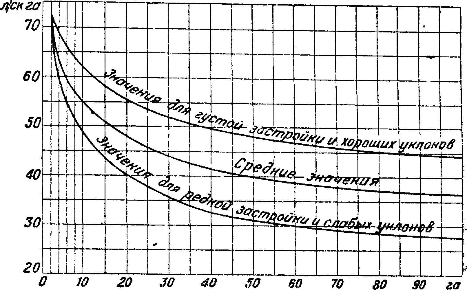 При поверхностях разного свойства коэф. стока определяется по ф-ле где означает различные поверхности со свойственными каждой из них коэф-тами стока φί. На фигуре 1 представлены два графика для ориентировочных подсчетов количеств притекающей к водостокам воды в л/ск га в зависимости от характера застройки, уклонов и размеров бассейна в га. При большой длине каналов, отводящих атмосферные воды, следует учесть замедление стока, характеризуемое к о э ф и ц и-ентом замедления стока гр. Расход В этом случае выразится величиной: