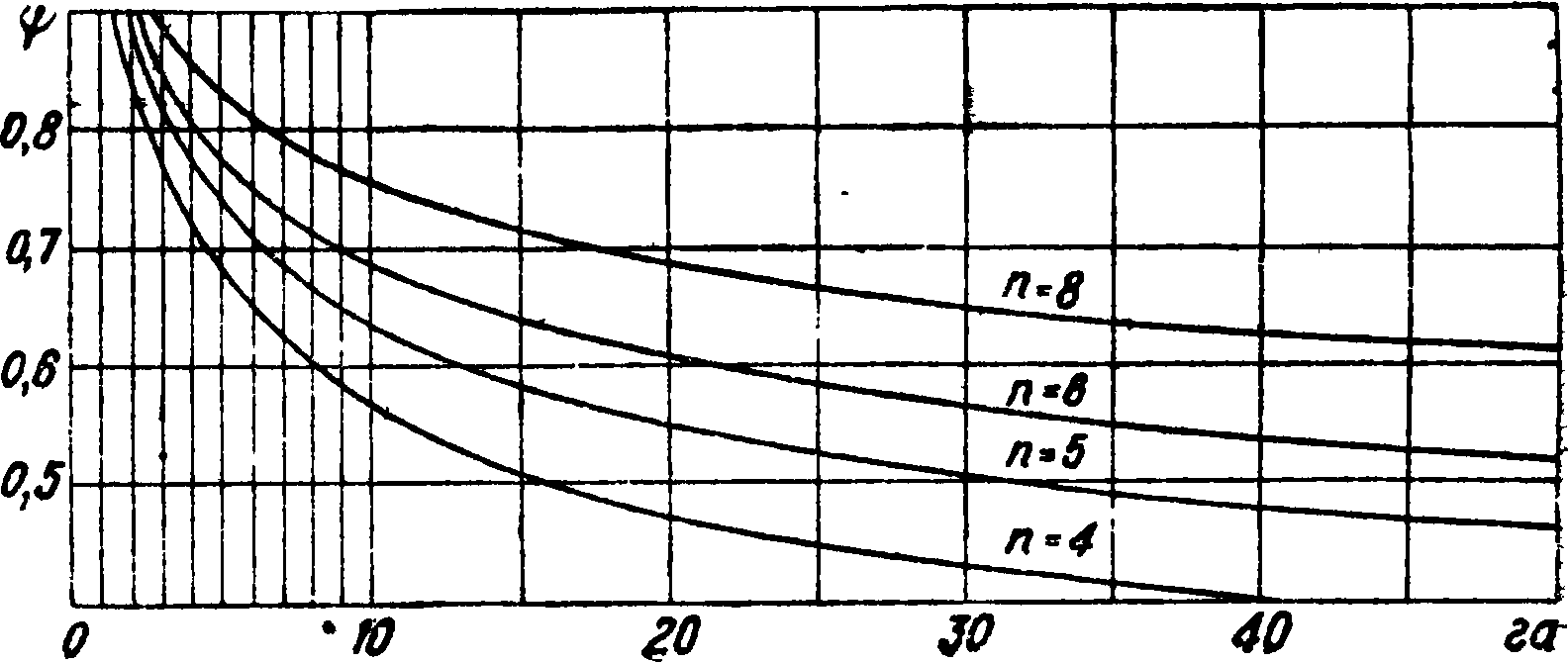 графика для определения коэф-та замедления стока на основании последней ф-лы в зависимости от величины п и площади бассейна, тяготеющего к рассматриваемому населенному месту. Коэф. замедления стока м. б. определен также приближенно в зависимости от дллины I лога“ причем гр=1 при I—0—400 метров ^=0,9 при /==400-^600 м: