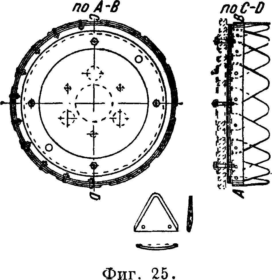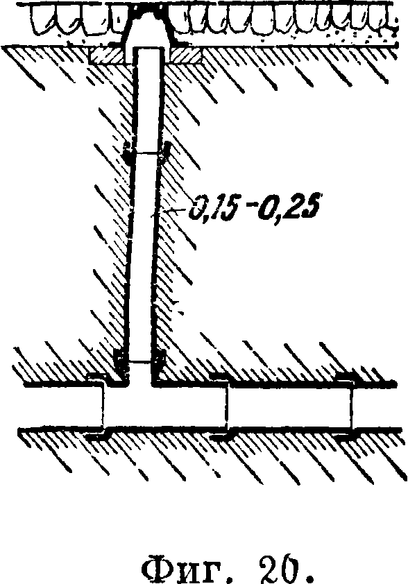 следует в смотровых колодцах устраивать грязе-ловок. Для опускания в смотровые колодцы в их стенки заделывают стальные скобы. Сверху смотровые колодцы закрывают съемными чугунными крышками диам. 0,50—0,70 метров Крышки не должен быть скользкими, поэтому их обыкновенно делают со вставленными в середину деревянными шашками, пропитанными антисептиками. Крышки эти иногда делают с отверстиями в средней их части (продушины) для прохода воздуха в целях вентиляции каналов. К таким крышкам часто прикрепляются особые ведра для задержания проникающей через продушины уличной пыли (фигура 19). При бетонных смотровых колодцах верхняя их часть между бетонной массой и рамой, на которой покоится крышка, состоит из нескольких рядов кирпичей, позволяющих лучше приспосабливаться к переменам в высоте располо-