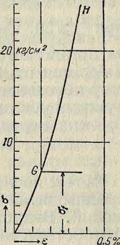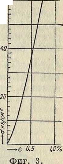 давления на оси. Детальное изучение показывает, что меньшим нагрузкам соответствуют относительно большие удлинен тния и коэффициенты упругости α=1: Е, то есть при меньшей нагрузке канаты отличаются относительно большей упругостью в работе. Бах дает для а величину между Υίοοβ и 1/10Шсм2/кг; соответственно этому зависимость между напряжением и упругим удлинением при работе изобразится кривой фигура 3. Следует отметить, что масштаб для удлинений ε фигура 3 по сравнению с фигура 2 в два раза больше.