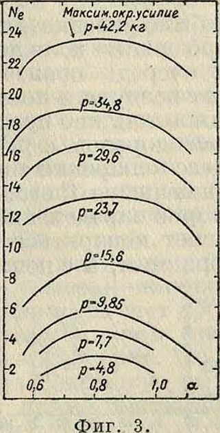 t. e. в случае струйного движения топлива коэфф. избытка воздуха а изменяется обратно пропорционально корню квадратному из величины напора или разрежения в корсете К. Таким образом, с увеличением количества протекающего через К. воздуха, а уменьшается, то есть рабочая смесь обогащается. Так, например, если при разрежении в 200 миллиметров вод. ст. щ=1, то при /i2=300 миллиметров вод. ст. α2=0,813. Т. к. в обычных жиклерах истечение топлива следует нек-рому промежуточному закону между случаями I и II, то обогащение рабочей смеси при увеличении числа оборотов мотора будет менее сильным, чем следует по ур-ию (25).