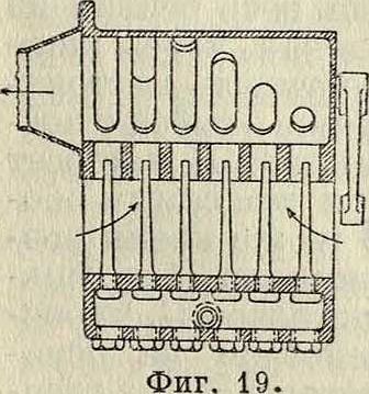 дяной очиститель и насыщается водой. Далее часть его, в количестве 2%, по трубе J направляется в смеситель, куда поступает и топливо из поплавковой камеры А, питаемой газойлем или керосином из бака посредством трубки Н. Полученная смесь топлива с первичным воздухом направляется в катализатор С. В катализаторе же смесь попадает в вертикальные металлич. каналы I (фигура 38), которые имеют с внешней стороны ребра, омываемые выхлопными газами, поступающими по трубам гиг2, г3 и г4 из мотора и уходящими из катализатора через патрубок ί. Выхлопные газы и первичная рабочая смесь двизкутся по принципу противотока. Перегородка внутри камеры выхлопных газов служит для разделения последних на два потока, благодаря чему, а также наличию заслонки, можно регулировать количество тепла, передаваемое смеси в катализаторе. Каналы I замыкает сменная крышка О, хорошо изолированная.