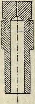 при малом отношении J к d (кривая D) коэффициент расхода для пределов изменения напора от 30 до 70 сантиметров вод. ст. почти не меняется, то есть форсунка дает истечение топлива, следующее параболическ. закону. Осуществляющая этот закон форсунка с острыми кромками не получила практич. распространения, так как требует большой точности обработки и потому является ненадежной в экс-плоатации, ибо малейшие неточности в ее размерах резко изменяют коэффициент расхода. Форсунка, изображенная на фигуре 17, хотя и не дает постоянства состава рабочей смеси, оказывается практически более пригодной, ибо значительные фиг 17 изменения угла и глубины конуса пг ‘ почти не влияют на закон истечения топлива, лишь бы был соблюден основной фактор отношения длины к диам.отверстия.