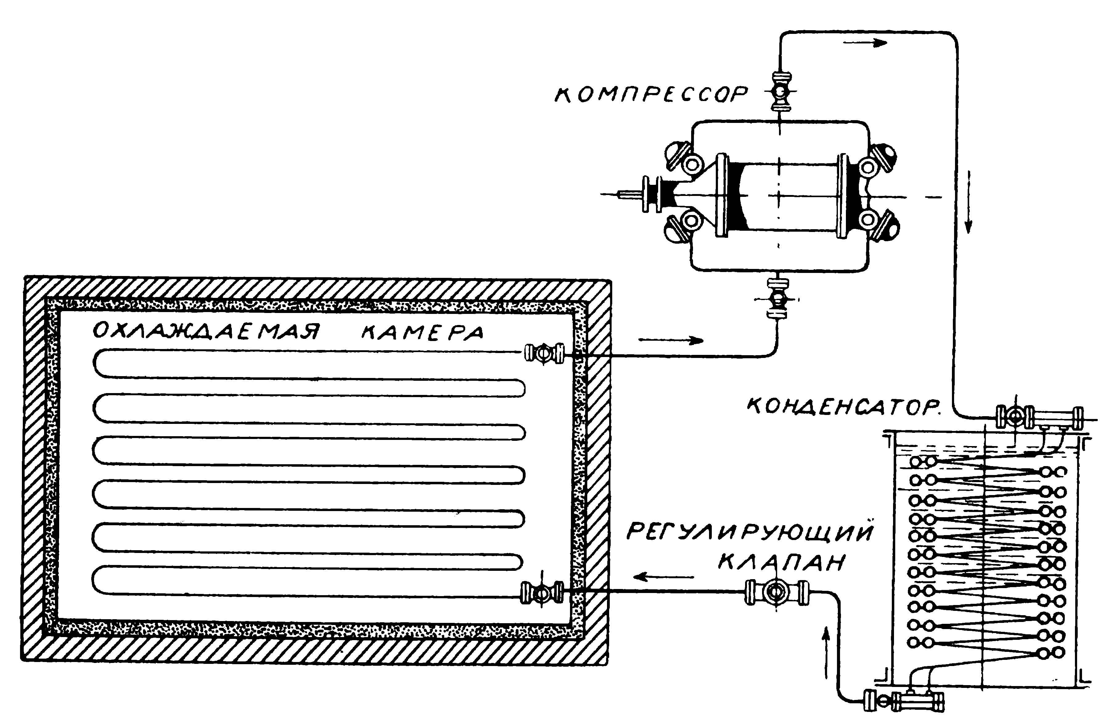 Конденсатор представляет собой систему трубчатых змеевиков и служит для охлаждения сжатого газа, так как при сжатии газа температура его сильно повышается. Охлаждение производится помощью холодной воды. В конденсаторе, благодаря охлаждению и наличию сильного давления, газ переходит в жидкое состояние. Ожиженный холодильный агент поступает далее в систему трубчатых змеевиков — испаритель (рефрижератор), где давление падает и происходит испарение жидкости. Превращение жидкости в газ — испарение ее — сопровождается отнятием тепла от окружающей среды. Из испарителя газообразный холодильный агент снова засасывается компрессором, сжимаетея и опять нагнетается в конденсатор для ожижения. Таким образом процесс возобновляется снова, причем количество холодильного агента не уменьшается, если не считать некоторых потерь вследствие неплотностей в соединениях.