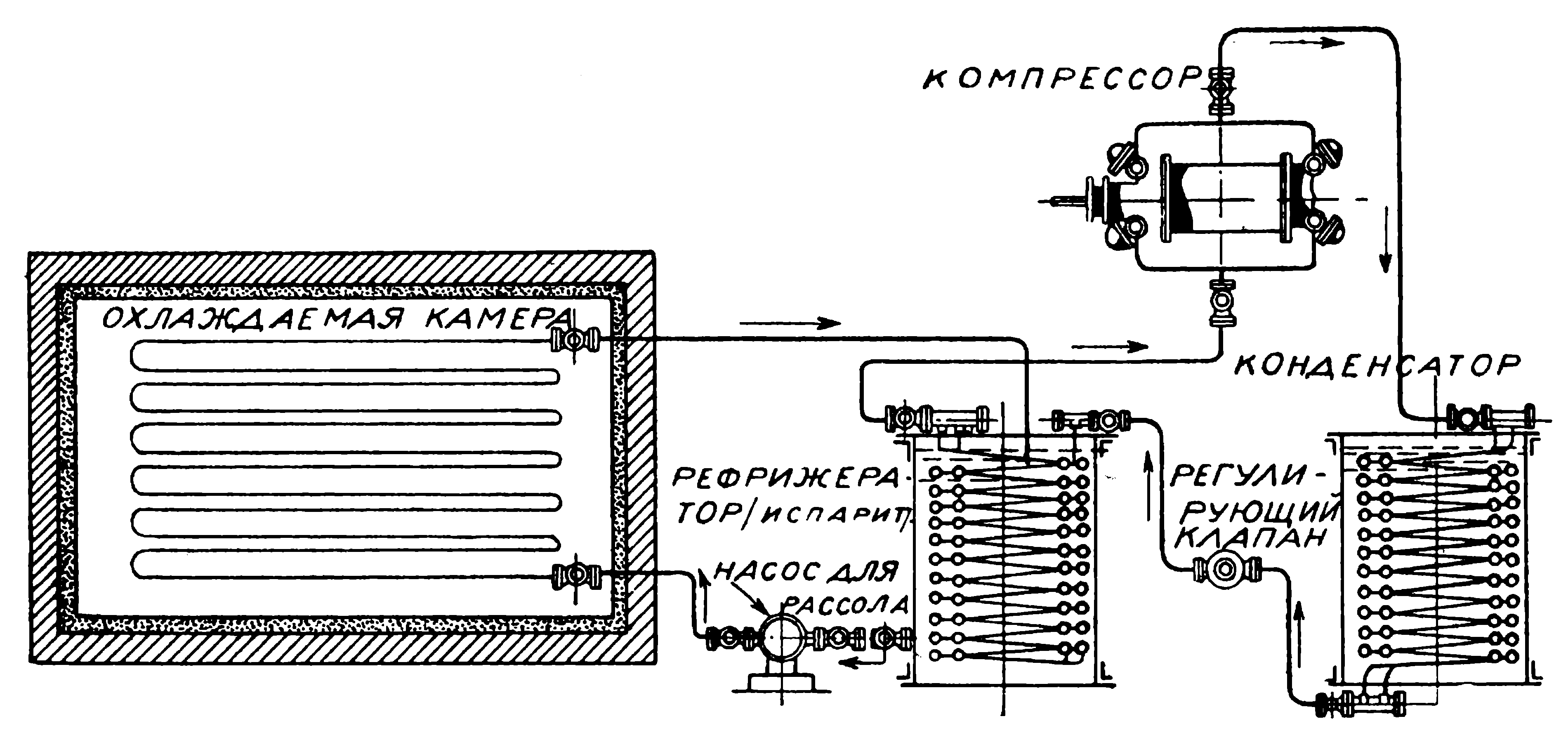 При охлаждении больших помещений (складов) лед неудобен, так как он сам занимает много места, а с другой стороны, не допускает регулировки температуры, что очень важно при хранении различных пищевых продуктов. В этих случаях пользуются особыми холодильными установками, где вместо льда употребляются другие вещества. В качестве охладителей могут употребляться различные вещества, но в практике предпочитают те, которые легко переходят из одного физического состояния в другое, так как переход этот в холодильных установках совершается применением механической силы. Чаще всего для этой цели служат аммиак, углекислота и сернистый газ. Работа холодильной установки заключается в следующем: компрессор, представляющий собою всасывающий и нагнетательный насос, производит сжатие охладителя (холодильного агента), находящегося в газообразном состоянии, и нагнетает его с повышенным давлением в конденсатор.