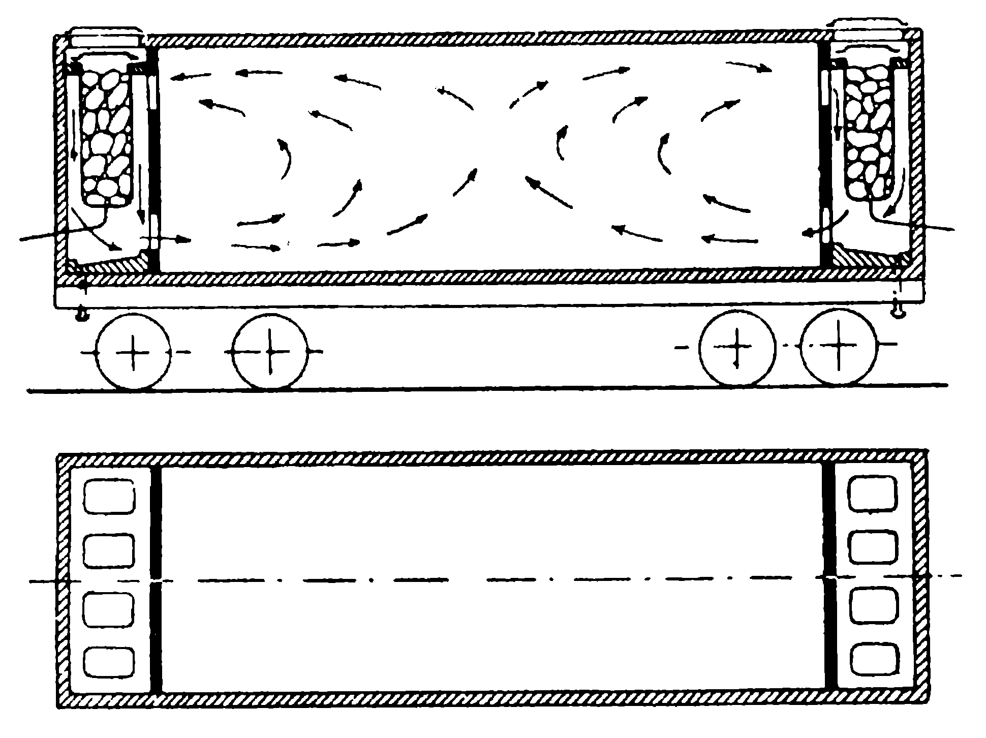 Искусственное охлаждение имеет широкое применение при перевозке скоропортящихся пищевых продуктов. Для этой цели служат вагоны-ледники, часто называемые „изотермическими“, то есть вагонами, в которых должна поддерживаться некоторая определенная, наивыгоднейшая для перевозимого продукта, температура. В водном транспорте существуют соответственно „баржи-рефрижераторы“. Применение для вагонов холодильных машин не рационально, так как они представляют собой большой мертвый груз и для обслуживания требуют постоянного персонала. Поэтому в этих случаях почти исключительно пользуются льдом или для достижения более низкой температуры смесью льда с солью. Схематически такой изотермический вагон в разрезе и плане представлен на рисунке 301. По бокам вагона в особых помещениях находятся железные баки со льдом, смешанным с солью. Лед и соль загружаются через крышу вагона. Холодный рассол, образующийся от таяния льда, остается в нижней части отделения, чем также используется для охлаждения вагона. Избыток его помощью особых сливных труб удаляется вон. Стрелками показана циркуляция воздуха. Холодный воздух, как более тяжелый, поступает снизу, охлаждает груз и, нагревшись, поднимается вверх; пройдя мимо баков со льдом, он охлаждается и снова охлаждает груз. Для того чтобы температура внутри вагона оставалась достаточно низкой и постоянной, он тщательно изолируется. Это достигается помощью двойных стенок, между которыми оставляют пустое пространство (воздух — плохой проводник тепла), или это пустое пространство заполняют каким-либо другим плохим проводником тепла — войлоком, пробкой и прочие.