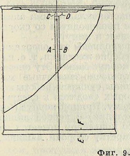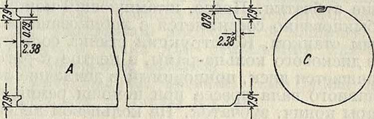 обрубаются, как изображено на фигуре 11, А, от них—к кромкозагибателыгому механизму Р (фигура 10), где узкие края полос загибаются для последующего образования продольного шва (фигура 11, В), и наконец к формирующему рогу станка, где плоская •еще пластинка сгибается в цилиндрич. форму, а загнутые кромки сцепляются и плотно обжимаются, образуя корпус банки (фигура 11, С и В).С формирующего рога корпуса жестянок автоматич. надеваются на рог паяльного станка, непосредственно присоединенного к корпусообразующему станку и синхронически с ним работающего. Здесь корпуса жестянок скользят вдоль рога, подходя сначала к диску, накладывающему на шов паяльную к-ту, и затем вдоль вращающегося паяльного валка, почти целиком погруягенного в ванну с расплавленным припоем из 40% олова и 60% свинца. Темп-pa припоя поддерживается между 300 и 330°, в зависимости от числа запаиваемых банок в минуту. Вращение лаялыюго валка и нек-рое трение его о шов