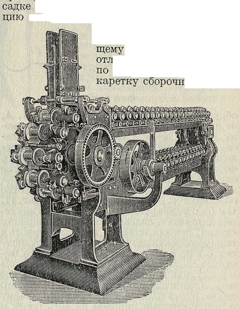 работают вполне автоматично, выравнивая лист под прямой угол и нарезая полоски для концов. Известны две модели зигзагообразных ножниц: одна—для нарезки полос для ординарного штампа и другая—для двойного. Для штамповки концов сконструирован «пресс-пулемет», названный так за свою большую производительность (до 360 штамповок в минуту). Нарезанные полосы жести складываются в стопы и переносятся подручным к автоматическ. прессу для выбивки концов. Конструкция этого пресса ничем не отличается от конструкции обычных наклоняемых прессов, с тою лишь разницею, что пресс снабжен весьма остроумным приспособлением для быстрой и автоматич. подачи полос к штампу. Пачки нарезанных полос жести помещаются рабочим в магазин пресса, расположенный слева от пресса; из магазина полосы по одной приподнимаются при помощи рычага с двумя-тремя присосками и переносятся им к захваткам питательной скалки пресса, имеющей прямолинейное, прерывно - поступательно - возвратное движение, что позволяет прессу при каждой остановке питательной скалки выбивать один, два или три конца в зависимости от конструкции штампа. Присоски питательного рычага представляют собою мягкие рези-
