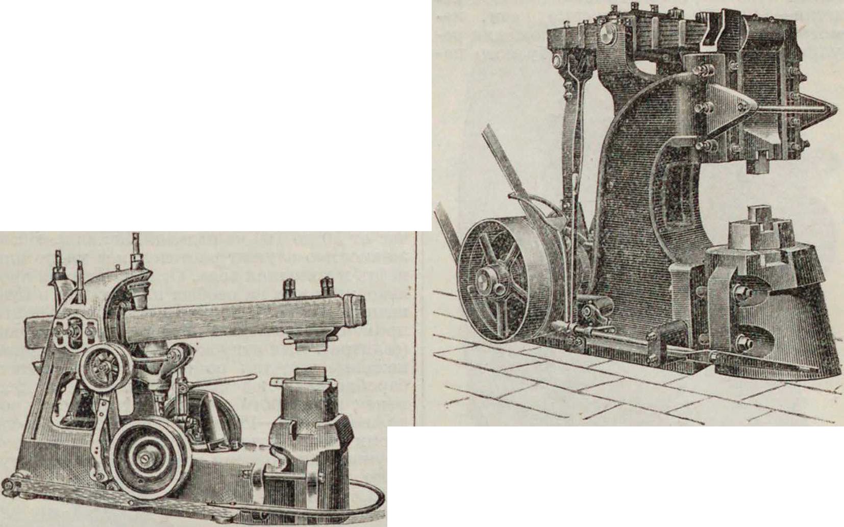 В Германии наряду с ковкой для получения ножевых клинков успешно применяют также штамповку, вальцовку на вальцах типа, представленного на фигуре 4, и специально прокатанную сталь соответствующих профилей. В США клинки складных ножей получаются штамповкой в холодном состоянии. Поясницы, бритвы, столовые ножи и вилки и нек-рые другие изделия штампуются, причем для штамповки в Западной Европе и в СССР применяются ремневые фрикционные молоты и винтовые фрикционные прессы, а в США фрикционные молоты с доской. На фигуре 5 изображен ремневый фрикционный молот с механизированным подъемом бойка. Вес бойков в зависимости от размеров штампуемых изделий колеблется от 200 до 600 килограмм. Вес чугунного шабота делается равным 20-кратному весу бойка. Число оборотов подъемных шкивов при бойках весом 200 килограмм—не свыше 100, при бойках свыше 400 килограмм—до 50. Высота параллелей не менее 2,5 метров Штампы изготовляются из углеродистой электростали с содержанием 0,8% С. Массовое производство ножевых изделий дало возможность выработать ори