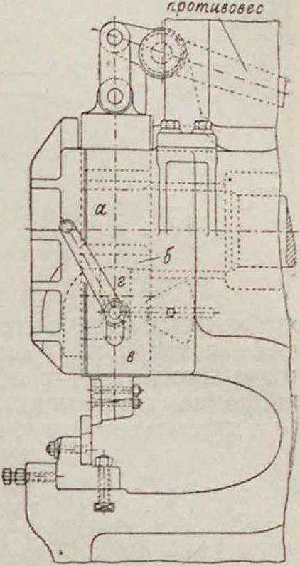 шипно-кулисного механизма изображен на фигуре 19. Откованный за одно с коренным валом кривошип а посредством кулисного камня б, ходящего в вырезе ползуна в, приводит последний в прямолинейно-возвратное движение. Нижняя стенка г выреза сделана для выключения работы ножевого ползуна при вращающемся вале Н. Иногда Н. с короткими ножами строят для упрощения рычажного типа, причем подвижной нож совершает качательное движение (фигура 20); особенно часто Н. этого типа применяют для разрезания старых железных частей на лом,так как в этом случае малая точность реза и нечистый разрез, характеризующие эту систему, не имеют значения, а возможность дать значительный ход и возрастание силы резания по мере опускания ножа как раз и являются весьма желательными при производстве упомянутых работ.