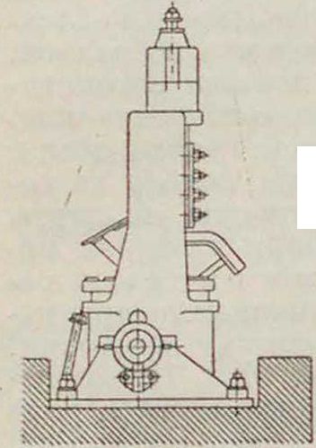 Вместе с рамой увлекается верхний нож г, который опускается под действием тяги е и, двигаясь вперед вместе с рамой, разрезает прокатываемую полосу. При обрати. ходе поршня прежде всего отклонится вправо верхний нож, поворачиваясь около оси д, что дает возможность прокатываемой полосе проходить свободно между ножами. При дальнейшем движении поршня рама а повернется и займет свое первоначальное положение. Скорость движения ножей в направлении движения разрезаемого материала должна быть равна скорости движения полосы при выходе из вв. Скорость же движения поршня должна соответствовать выбранной длине, на которую должна разрезаться полоса. Другая конструкция качающихся II., получивших большее распространение в Зап. Европе, изображена на фигуре 38. Эти Н. также состоят из вертикальной рамы, поворачивающейся около горизонтальной оси. Разница с ранее описанными Н. состоит в том, что верхний нож приводится в действие от парового цилиндра, сидящего наверху качающейся рамы; при работе рама Н. наклоняется в сторону движения полосы и в момент, когда передний конец последней соприкасается с особым выступом на II.,—открывается парозапорный клапан цилиндра. Поршень этого цилиндра при посредстве штока приводит в действие верхний нож, причем последний, по прекращении действия на него пара, быстро перемещается назад. Отрезанная заготовка падает, и рама вследствие действия пружины быстро приходит в первоначальное положение. Отдельные движения Н. этого типа происходят очень быстро. Разрез получается ровный и гладкий. Указанные конструкции автоматич. Н. применяются для разрезки заготовки сечения от 20 х х 20 миллиметров до 50 х 50 миллиметров при скорости прокатки или поступательного движения прокатанной полосы к II. до 3 метров в ск. Для разреза полос мелкосортного железа на разную длину и при разной скорости прокатки применяются т. н. вращающиеся Н.
