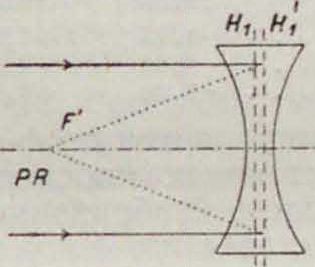 .помещают перед глазом отрицательную линзу так, чтобы ее задний фокус F совпадал с дальней точкой PR глаза (фигура 2, где Н1 и Н —главные плоскости линзы и Я2—передняя главная плоскость глаза), тогда параллельный пучок света от удаленного объекта даст его изображение в задней фокальной плоскости линзы, а т. к. эта плоскость совладает с дальней точкой, то на сетчатке не-аккомодированного глаза получается резкое изображение, и объект виден резко. Аналогично при гиперметропии перед глазом помещается положительная линза так, чтобы ее задний фокус F (фигура 2) совпал с дальней точкой PR-, на сетчатке и в этом случае получают резкое изображение. Если бы можно было совместить заднюю главную плоскость Щ линзы с передней главной плоскостью Лг глаза, то величина аметропии (миопии или гиперметропии) была бы численно равна рефракции линзы, соответствующей полной коррекции глаза. В виду невозможности такого совмещения необходимо принимать во внимание расстояние между задней вершиной линзы и вершиной роговицы.