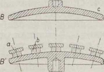 помешается от 4 до» 80 линз. Затем [на смоляные пробки Ь накладывается сверху разогретый чугунный корпус: выпуклый (в виде гриба) В при выпуклых-поверхностях линз и вогнутый (в виде чашки) А при вогнутых. Смола с линзами при остывании корпуса приклеивается к нему и формовочную чашку удаляют. Заготовленный так. обр. выпуклый корпус а (фигура 15) с линзами (или выпуклая шлифующая чашка) навинчивается на вертикальный шпиндель b шлифовального станка. Вал с при помоши дисковой или фрикционной передачи передает вращение шпинделю Ь и эксцентриковой шайбе h. Скорость вращения шпинделя и шайбы можно регулировать. Рычаг I качается взад и вперед около оси д в горизонтальной плоскости с помощью передаточного рычага, соединенного с шайбой h. Качание рычага I передается