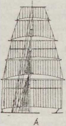 При недостаточности длины мачт для несения необходимой парусности в верхней части их укрепляется второй ряд вертикальных деревьев—с т е н ь г и. Названия стеньг составляются из названий мачт с прибавлением слова стеньга: фор-стеньга—2, грот-стеньга и т. д. Длина грот-стеньги— 10,10—19,30 .и, других несколько меньше. Далее устанавливают третий ряд вертикальных деревьев—брам-стеньгк, название которых также зависит от мачт—3 фор-брам-стеньга. Четвертого ряда деревьев (бом-брам-стеньги) теперь уже не устанавливают, придавая верхним частям брам-стеньги названия: бом-брам-стеньги, трюм-стеньги и флагштока с добавлением названия соответствующей мачты. Длина брам-стеньг 6,80—19,10 метров Толщина мачт и стеньг зависит от их длины, при этом мачта толще всего у пяртнерса (в месте прохода через палубу), несколько тоньше у шпора (основания), еще тоньше у салинга и самая тонкая у верхушки—т о п а. то есть имеет бочкообразную форму. Так, для 25-м мачты ее диаметры (считая снизу) будут 560—700—530—450 миллиметров. Стеньга толще всего у шпора и утончается к топу, имея конич. форму. Для 15-м стеньги диаметры будут 450—400—330 миллиметров. Т. к. часть длины мачт и стеньг уходит на соединение между ними, то полная высота верхней части брам-стеньги над грузовой ватерлинией несколько меньше суммы длин вертикальных деревьев, но все же достигает 50 метров.