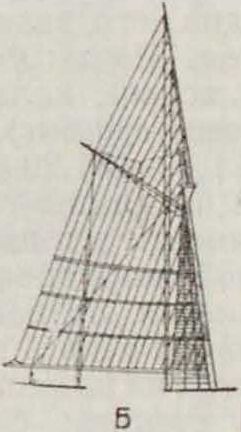 мыми, меньших размеров. 3)Рейковое (фигура 1. В)—парус поддерживается подвижным рейком. Употребляется на шлюпках и иногда для верхних прямых парусов при гафельном вооружении. 4) 111 п р ю и т о-в о е (фигура 1, Г)—вафельный парус, без гика, подкреплен косым шестом (ширюйтом); для шлюпок. 5) Португальское (фигура 1, Д) и 6) латинское (фигура 1, Е), еще более упрощенные; для шлюпок.
