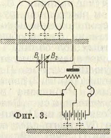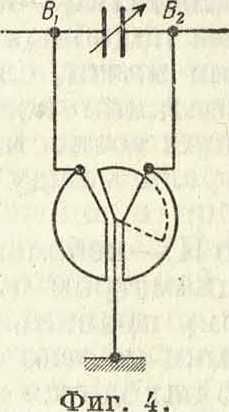 вычисляется из выражения tg <5=~, где а—площадь замкнутой фигуры, образуемой проекциями витков рамки на плоскость, перпендикулярную плоскости рамки; п— число витков рамки и S—площадь каждого витка. Обычно ошибка <5 меньше одного градуса и легко устранима. К явлению бокового эффекта относится и эффект Бляберма-на (емкостная связь между отдельными витками рамки с учетом шунтирующего эти емкости провода). Смещение минимума в этом случае при неблагоприятных обстоятельствах вообще не превосходит 4t°. б) Расположение выводов рамки в плоскости, не совпадающей с плоскостью рамки, при некотором удалении проводов друг от друга, дает эффект, отчасти аналогичный боковому эффекту рамки; обыкновенно эта ошибка незначительна. в) При приключении рамки к приемнику получается электр. асимметрия рамки, обусловленная вносимой в контур рамки емкостью относительно земли, аккумуляторов и телефона, присоединенных при схеме (фигура 3) к одному из зажимов рамки. Получается т. н. эффект открытой антенны, который обычно устраняется или введением специального конденсатора—компенсатора, состоящего из двух групп неподвижных. пластин и одной группы подвиж-ных и подключаемых согласно схеме фигура 4, или в сильной степени ослабляется приключением приемника к рамке по схеме фигура 5.