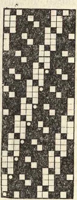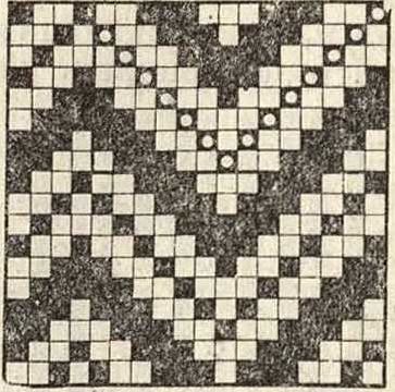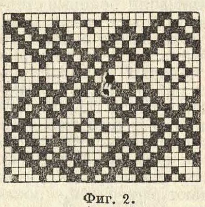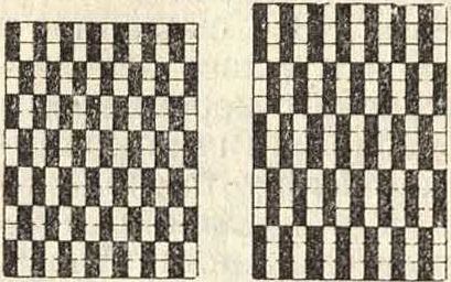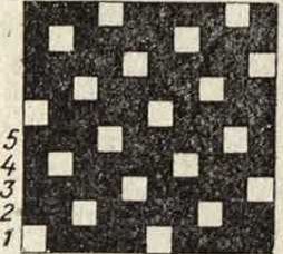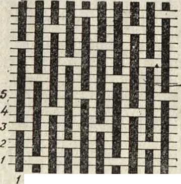 ются краской.Квадратики, соответствующие·· уточным перекрытиям, оставляются пустыми (фигура 5). Следовательно закрашенные· квадратики каждого горизонтального ряда, рисунка П. т. будут представлять собой нити основы, покрывающие нить утка, а незакрашенные квадратики, наоборот,—нить утка, покрывающую нити основы. Изображение на бумаге рисунка П. т. в размере-всей ткани не требуется, достаточно на рисунке изобразить раппорт.